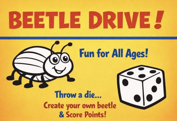 A lively opportunity to throw a die to create your own beetle and score points, in aid of the Hall improvement project).